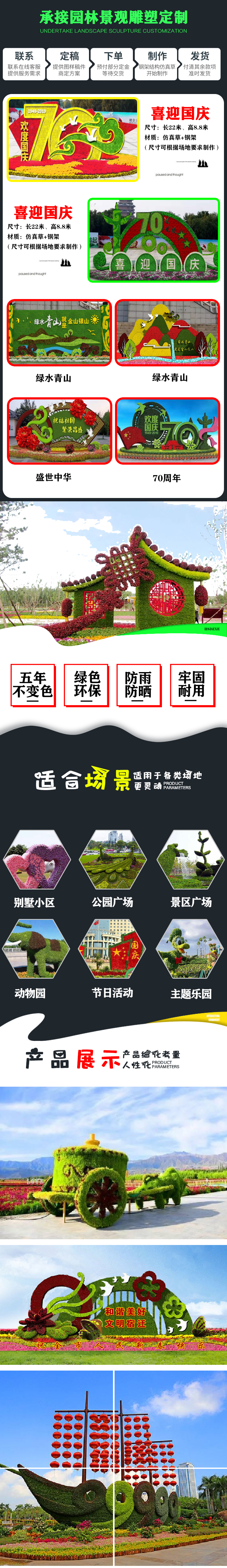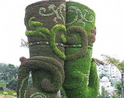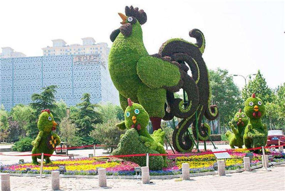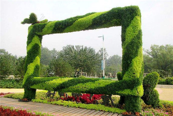 在景区、主题公园和咱们的生活中,通常看见一些艺术作品,其中绿雕便是当中好看的一道风景,随着绿雕式样的不断进展,技巧愈来愈准确,细节样式纹理刻画从而更加细致。“高颜值”不只是能够吸引人们过来赏玩、合影留念,还能美化周围、渲染出欢乐气氛,提升景区、主题公园的品味及形象。绿雕又叫绿色雕塑,被称为世界园林艺术的奇葩,是具有生命的植物雕塑,一般来说内设钢材架构,接着在构架上填充栽培土,再于其上培育一年生及多年生小灌木及草本植物,即运用挂泥插草及卡盆工艺把不同颜色的花草覆盖在结构技巧的表面上,很好地把雕塑技巧与花卉园艺结合在一起,钢架表面上的植物覆盖率起码要得到80%。